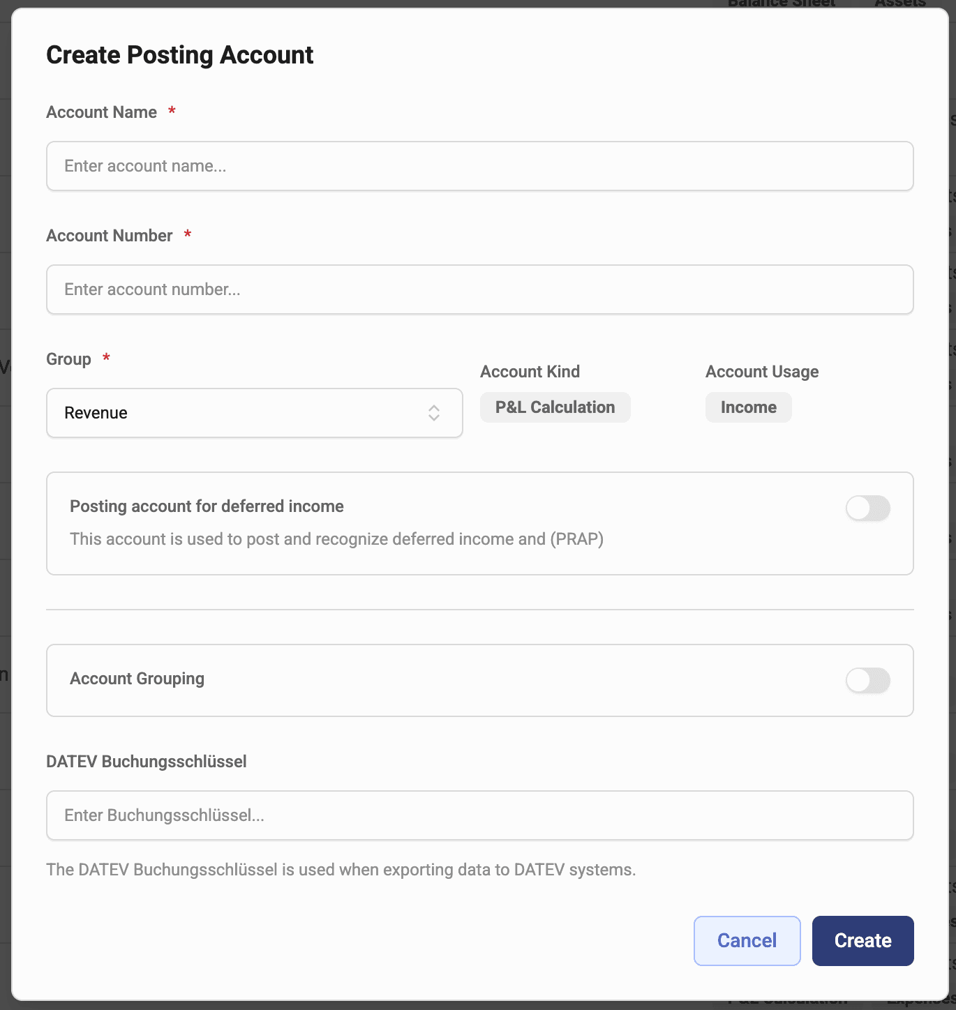 - Fill in account name, number and group. Specify whether this is an account for deferred income.