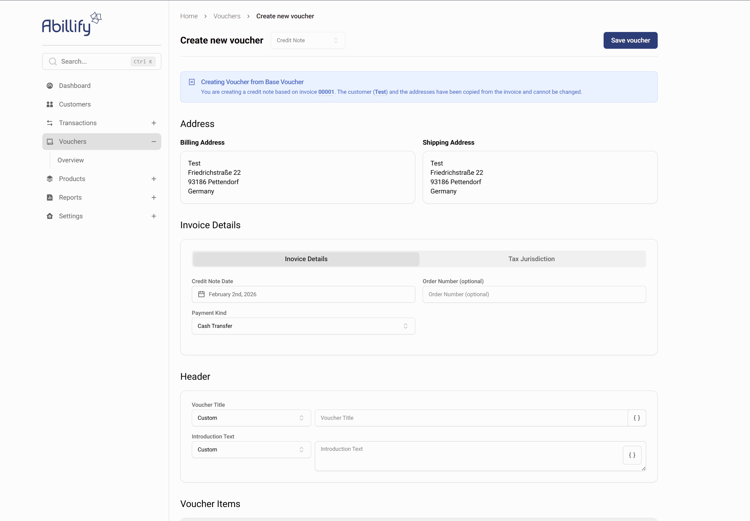 “Creating Voucher from Base Voucher” - Customer and address data are copied from the invoice