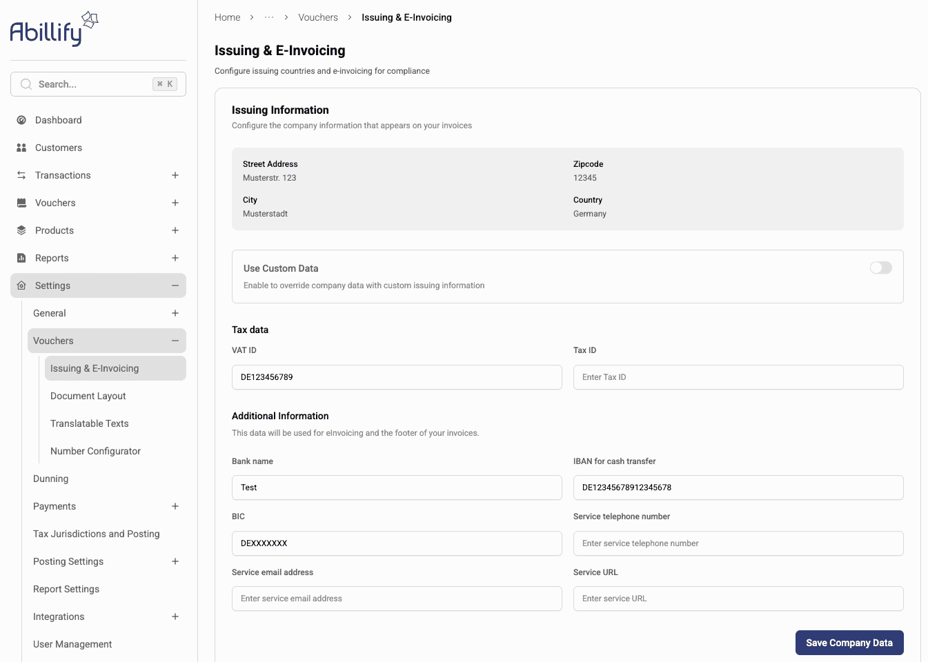 This step defines the company and tax information that appears on invoices and enables e-invoicing.